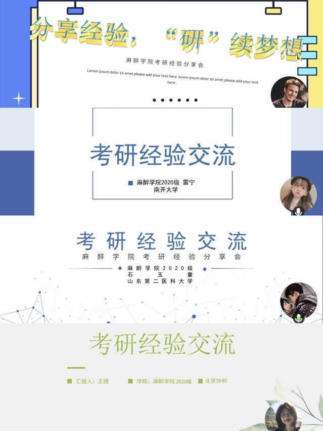 分享会开始阶段,由路鹏飞老师针对本校复试注意事项以及面试穿着进行专项讲解,提醒学生做好复试全流程准备;2025届毕业生、南开大学在读研究生雷宁学姐从面试着装、英语学习、面试技巧以及专业学习等多维度分享实用经验。雷宁结合自身复试经验,强调面试时需要注重自身陈述,遇到难以回答的问题时可以从麻醉前准备、术中管理和术后处理等方面结合实际经验进行阐述。在简历撰写上,雷宁学姐强调要避免大段陈述性文字,介绍自己时要突出重点,凸显自身竞争力;正妹av 2025级研究生班长石玉童聚焦本校复试注意事项,介绍了本校考研的流程,结合历年考试内容以及自身考试经验分析考察重点,为学弟学妹们的复试准备指明方向。学长还引用了复试评委老师的寄语,鼓励同学们以扎实的专业功底和从容自信的心态迎接考验;2025届毕业生、协和医学院在读研究生王捷学姐则是从考试内容出发,强调了在实验复试中需牢记基本运算逻辑,明确老师考察重点,提示学弟学妹们把握备考难点重点。