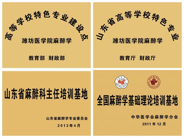 潍坊医学院麻醉学专业于1990年经教育部批准设置,是山东省高等医学院校最早设立的麻醉学专业。该专业先后在1996年被国务院学位委员会批准为“麻醉学硕士学位授权点”,2007年被确定为“山东省高等学校特色专业”,2010年被教育部、财政部确定为“高等学校特色专业建设点”,2011年被中华医学会麻醉学分会确立为“全国麻醉学基础理论培训基地”,2013年被山东省医学会麻醉学分会确立为“山东省麻醉科主任培训基地”,2013年临床麻醉实验室被山东省卫生厅批准为 “山东省医药卫生重点实验室”,并在2019年获批山东省一流本科专业……