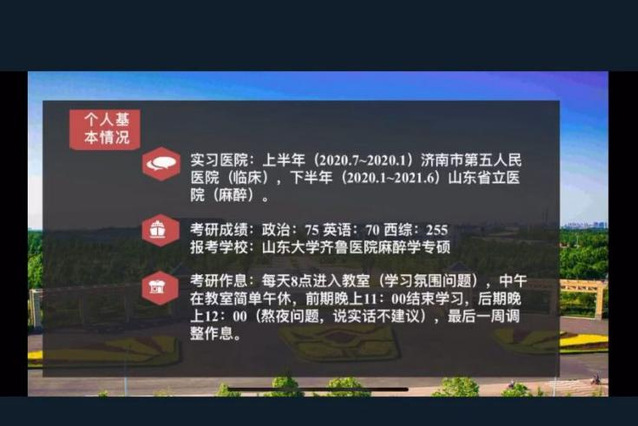 活动邀请考取山东大学齐鲁医院麻醉学专业专硕的巴艳哲同学和考取潍坊医学院麻醉学专业专硕的黄静瑶同学进行考研历程分享,交流心得感悟。结合自身实际,巴艳哲从自己备战考研的整体学习规划和心理建设为同学们进行了讲解,同时对于当下存在的不同专业课网络课程的类型和授课特点提出了自己观点,供同学们参考,以便同学们根据自身实际有效选择、高效学习。黄静瑶详细介绍了实习期间考研复习计划和学习方法,为同学们讲述了复习期间的心态问题与有效调节。分享会上学习气氛热烈,针对同学们提出的种种考研疑问,二位同学一一解答。