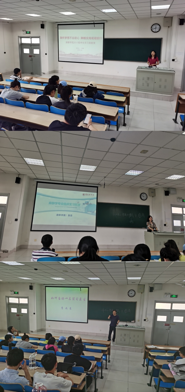 会上,刘娜以《胸怀梦想不忘初心脚踏实地砥砺前行》为题,从专业人才培养、学习工作过渡、职业生涯规划三个方面向同学们讲述了实习的意义与重要性,叮嘱同学们在实习期间牢固树立安全、学习、纪律、合作、形象意识。张蕊以《麻醉学专业临床实习标准》为题向同学们介绍了35家实习医院的总体情况,并对实习大纲、实习鉴定与考核、规章制度等做了详细说明,希望同学们在“生命至上,人民至上”思想的引领下顺利完成实习任务。隽兆东以《如何当好一名实习医生》为题,从树立以病人为中心的思想,如何处理好麻醉与其他科室关系、实习与考研关系、实习与就业关系等方面结合案例进行了具体阐述,对同学们达到“全科”水平提出了更高的要求。