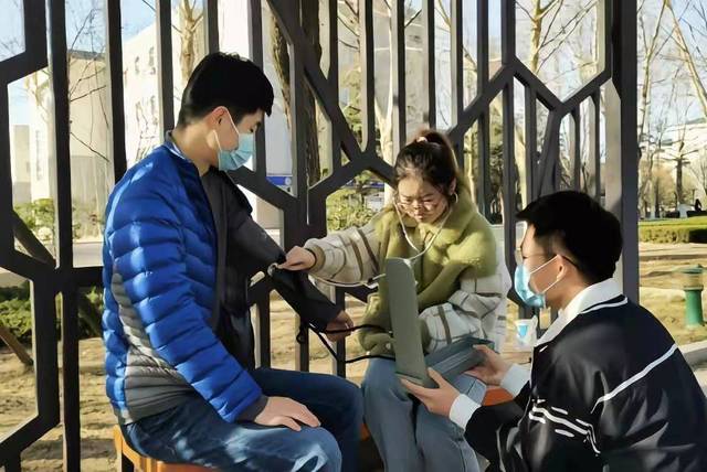 3月5日,正妹av 青年学生开展“弘扬雷锋精神,争做当代雷锋”公益活动,于教学楼前及学校警务室为来往师生和警务人员测量血压。