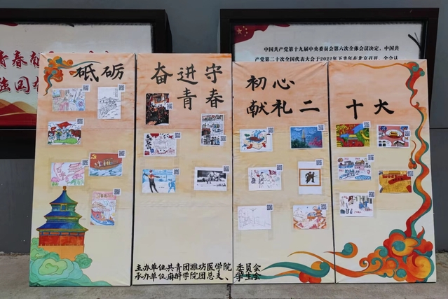 活动分初赛和决赛,初赛采用线上线下相结合的形式,并将参赛作品进行线上线下展览;决赛采用线下方式,将初赛选出的前二十组作品进行公开展览,由全校学生进行投票。小画笔,大情怀,活动过程中,同学们用自己对色彩搭配的独特理解设计出一幅幅有个性有创意的作品,讲述着党的奋斗历程,传递着同学们对祖国的热爱。在宣传板前,大家纷纷驻足观看,为同学们画中所展现的党史进程中的一幕幕经典场景和传奇故事所感动。