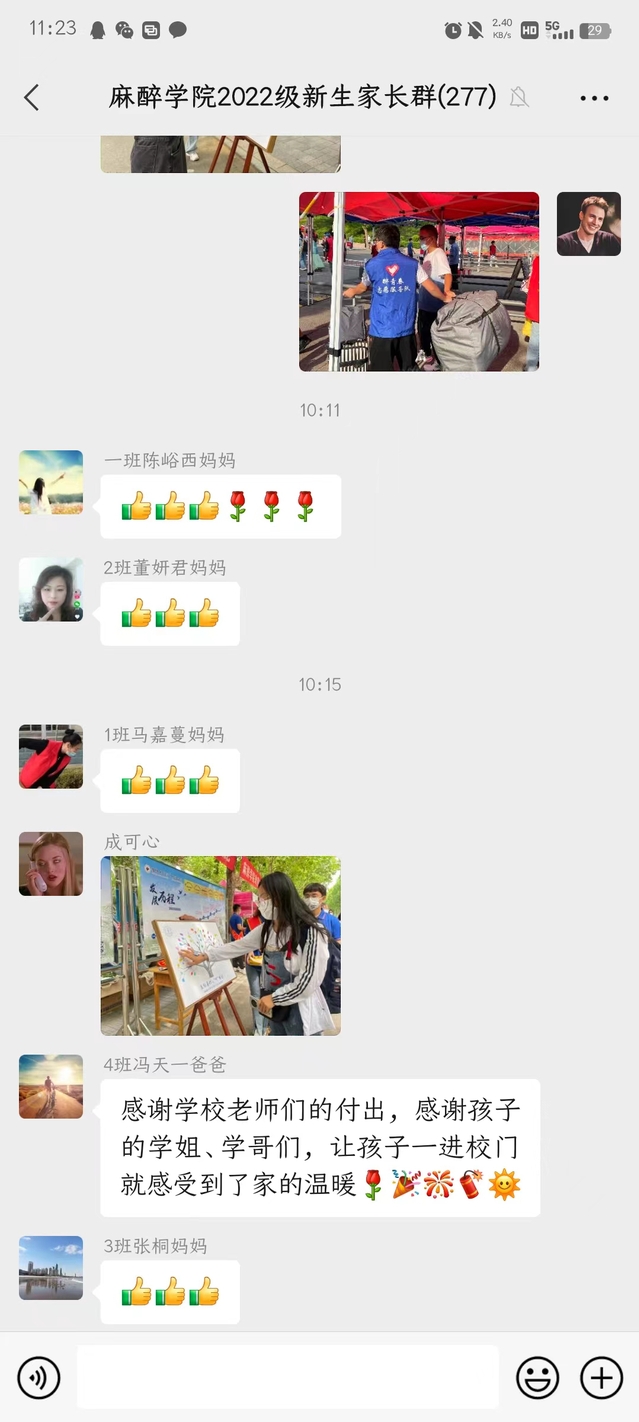 家校联动“醉”暖心。学院通过新生家长群将报到现场的照片、视频进行实时更新,内容涵盖新生入学报到流程、宿舍环境、校园美食美景等方方面面。学院老师也在群里实时与家长交流、答疑,让家长放手又放心。