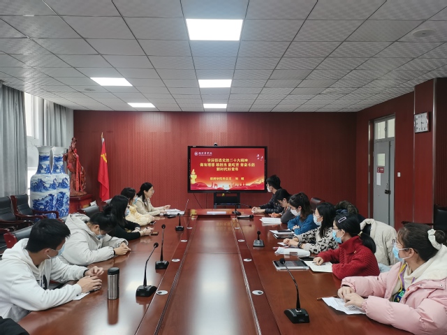 12月8日下午,正妹av 党总支书记刘娜在敏行楼31418会议室为学生党支部党员、入党积极分子代表宣讲党的二十大精神。
