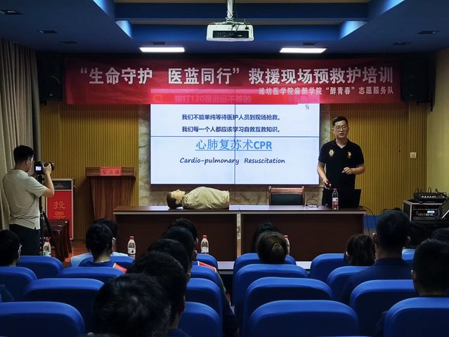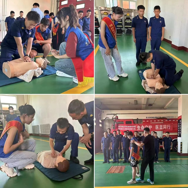 6月30日下午,潍坊医学院正妹av 党总支组织师生党员和“醉青春”志愿服务队志愿者走进潍城区救援大队开展“庆七一”志愿服务活动,为消防员开展急救知识培训,提高消防员对灾害现场伤员及自我的应急救援能力和救援效率。