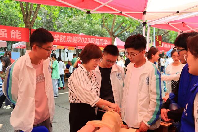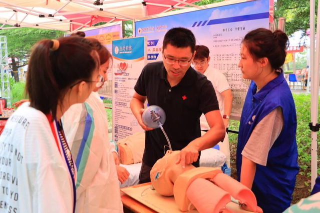 “醉”精心——特色活动 实践体验。在麻醉技能体验区,援鄂医师、“地摊式推广心肺复苏”活动发起人张军桥化心动为行动,耐心细致的为报道新生讲解心肺复苏的操作步骤和AED的使用方法,带领新生亲自上手实践体验,新生们在亲身实践中增强了专业自豪感,感受到了一次非同寻常的技能体验。