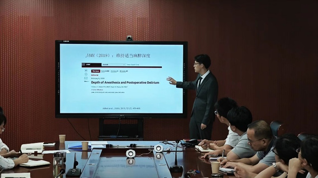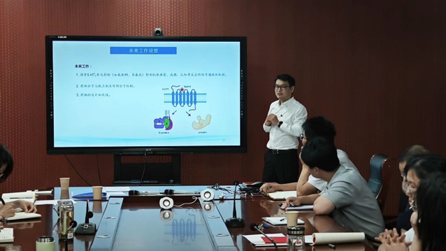 新进教师王世山、钮昆博士做了精彩汇报。王世山博士,毕业于法国里昂大学,以《血清素受体7的结构药理学研究》为题,分享了他在中国科学院分子细胞科学卓越创新中心的研究。王博士首先介绍了血清素受体7的生理功能及其信号通路等研究背景,随后围绕“血清素受体7与致幻剂LSD的相互作用”汇报了最近的研究成果。随后,毕业于中国科学院大学医学院麻醉学专业的钮昆博士,以深麻醉还是浅麻醉影响认知功能的问题引入,回顾了围术期神经认知障碍的动物研究和三氧治疗股骨头坏死的临床研究进展,从实验到临床,由现状至未来等多个方面由做了精彩的讲座。与会教师就自己感兴趣的科研问题与两位博士进行了热烈的交流。