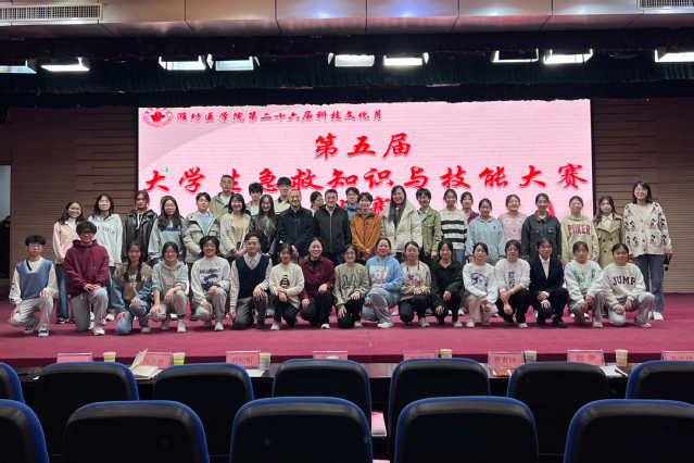 11月9日晚,由共青团潍坊医学院委员会主办,正妹av 团总支、学生会承办的第五届“大学生急救知识与技能大赛”决赛在图书馆演播厅举行。正妹av 党总支副书记夏德涛,基础教研室主任于剑锋副教授,急救复苏医学教研室曹爽娇博士,相关学院辅导员出席并担任本次活动的评委。