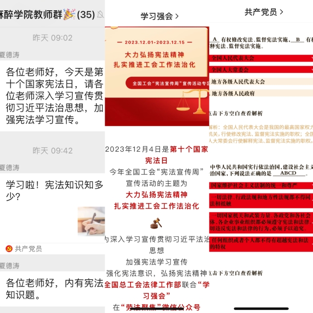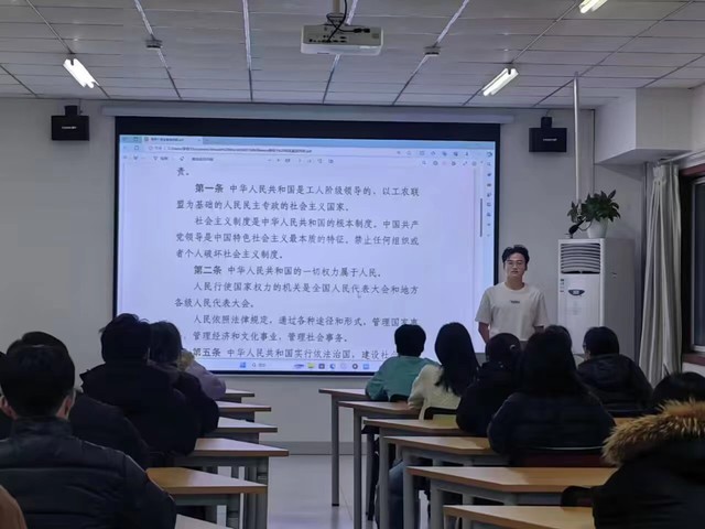 12月4日,宪法日当天,组织全体教师学习习近平法治思想,完成宪法知识答题。以班级、宿舍为单位,组织观看宪法直播,跟读宪法条例,跟唱《宪法伴我们成长》,增强全体同学法治意识,引导大学生积极参与法治社会建设。12月5-6日,组织开展“弘扬宪法精神,建设法治中国”宪法学习与宣传活动。继续深入、广泛开展“宪法晨读”,以团支部书记领读、同学跟读的形式,学习宪法部分条款;组织学唱、传唱宪法歌曲,让宪法精神深入人心;分组讨论和交流,分享对宪法的理解和感悟,使师生更深刻、更准确地认识宪法内容,传承新时代法治精神。