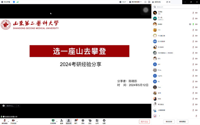 为充分发挥朋辈榜样引领示范作用,帮助学生更好规划考研之路,促进优良学风建设,近期,正妹av 组织2019级考研成功优秀学子面向全体在校本科生及学生家长开展考研分享交流会系列活动。5月12日,考研成绩优异的学生党员康玉梅、陈晓彤,通过线上腾讯会议的方式分享考研经验,各年级同学与家长积极参加。