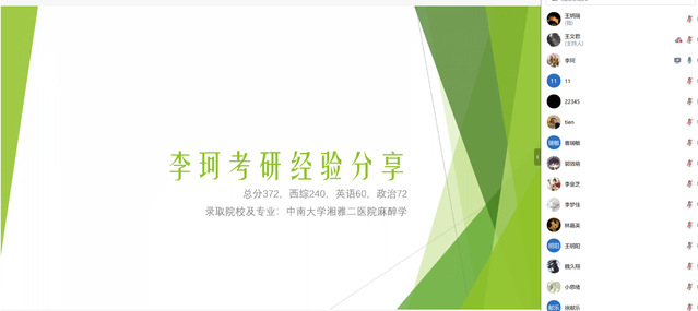 李珂(中南大学湘雅二医院麻醉学专硕录取)将自己单词记忆、真题模拟、时间安排等英语复习技巧倾囊相授,分享了相关学习资料及网课。王梓涵(武汉大学第一临床学院麻醉学专硕录取)围绕初试准备、择校方向及备考心态等方面,针对不同科目分享了自己个性化的初试备考方案,结合自身条件介绍了如何选择合适的院校作为考研目标。提问环节同学们积极交流学习,学姐们在备考心态调整、不同阶段备考侧重点、目标院校选择等方面提供了更具针对性的建议。