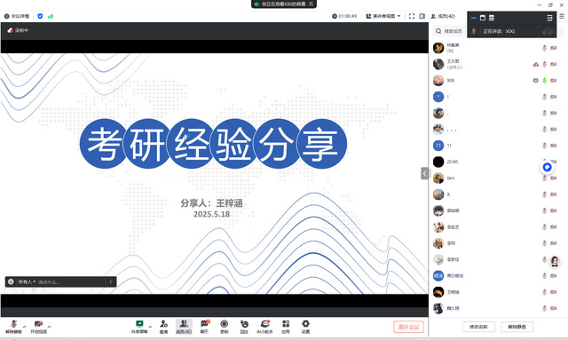 为强化学风建设,解答学生关切,5月18日晚,2025年考研成绩优异的李珂、王梓涵同学线上分享了学习方法及考研经验等,各年级同学、学生家长踊跃参加。